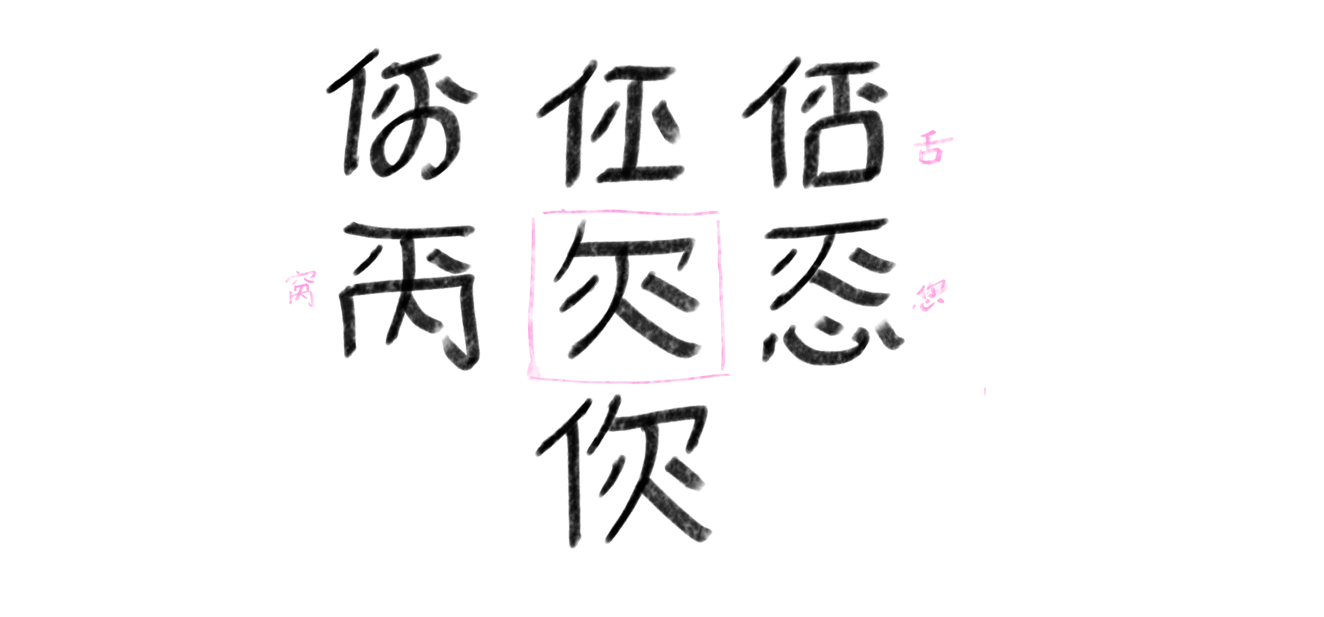 If we try to Huoontify it we might get something like ♡囧骨, but for the most commonly used pronoun it’s probably too long. 我 iꝬ actually an ancient pictogram depicting a barrier of swords or someϑiŋ similar which iꝬ cool, ⅋ut ï find ϑ’adoption of it to use for ϑ’most common pronoun of all time as a phoneme quite uninspired. So non-bidenary of me. Characters like this, that are completely divorced from their original diagram’s form, seem to be the most open to adaption, because turning it into an A-signifying sign involves replacing the whole thing for anything we might want. 窩 iꝬ already used & recognised iṋ Chinese post-irony innerweb circles, where itꝬ used phonetically as a lazier more casual sounding 我 “wo” b∵c it lacks tone, so that’s my personal favorite. Woe is me 囧!